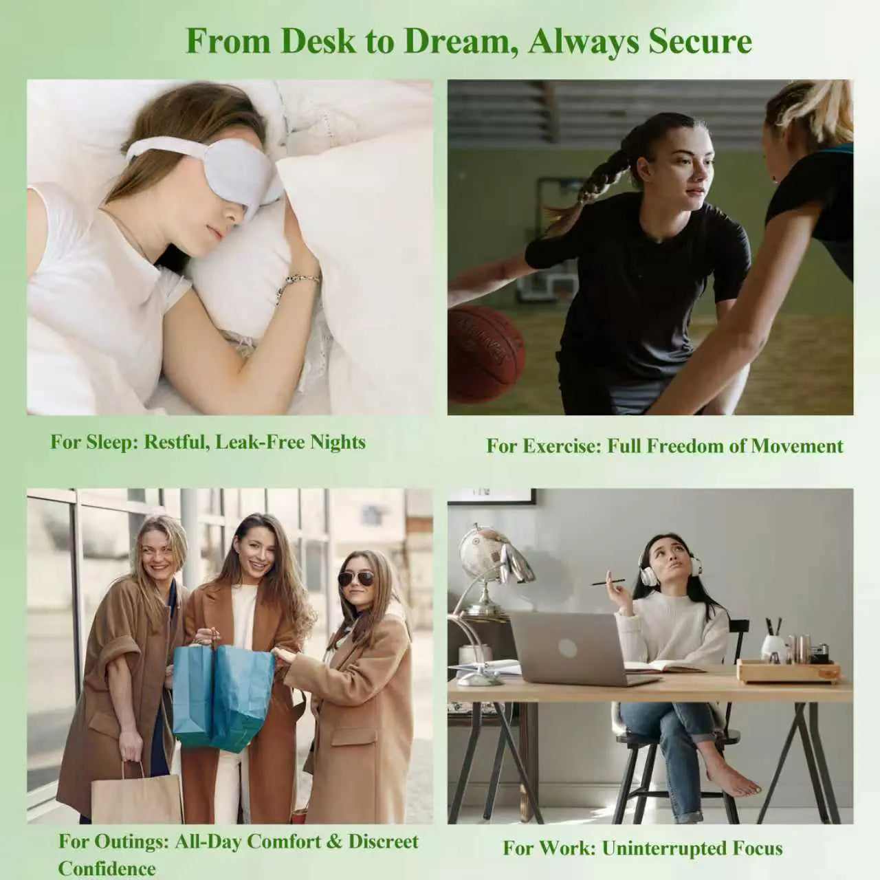 3. Day and Night Safe: Stay leak-proof while you work, exercise or sleep without interruption. Front and back protection for any posture.