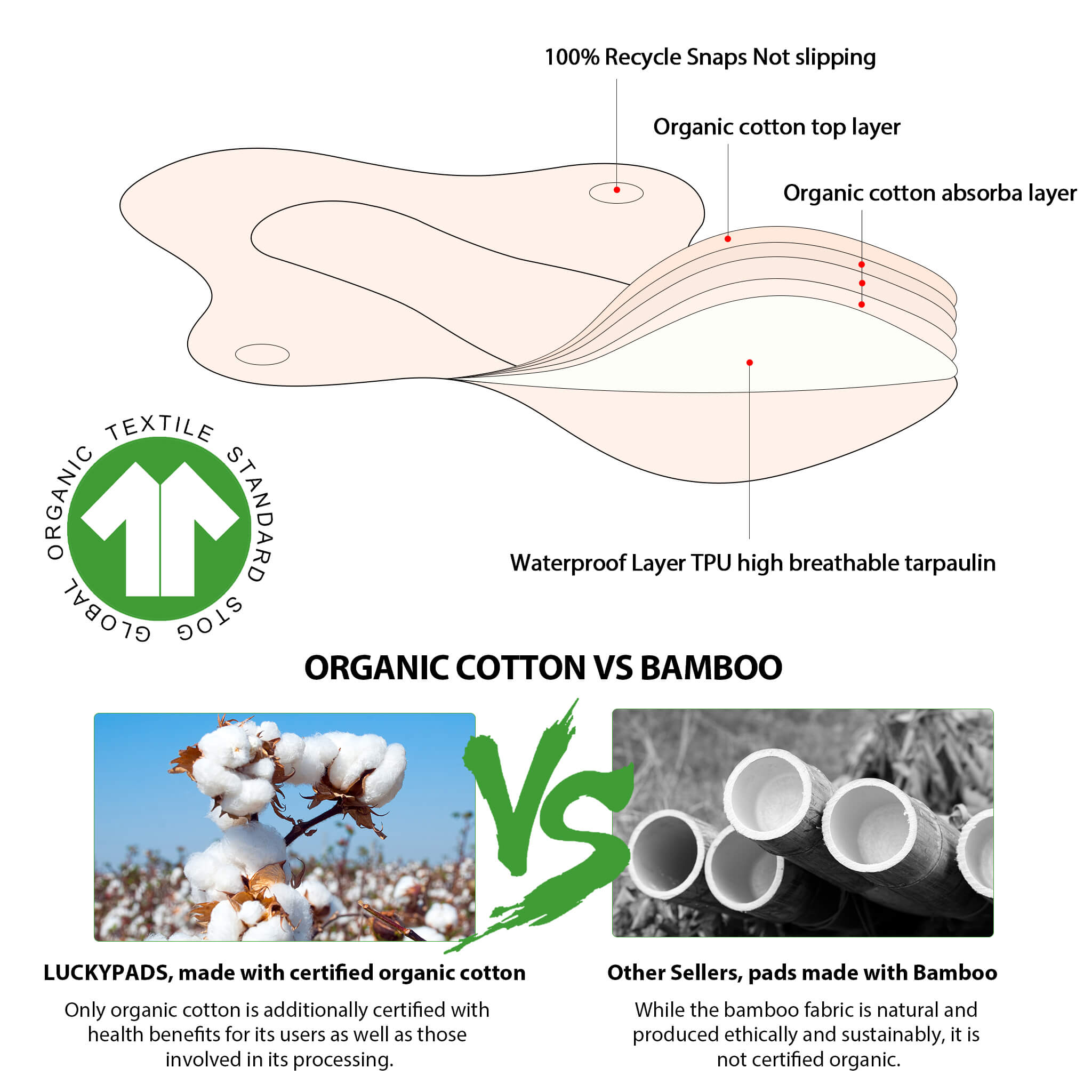 • Material: our reusable pads are made with GOTS Certified Organic Cotton, without harmful bleaches or chemicals. Absorbs leaks and odors in seconds, keeps you clean and 5X drier feeling all day long.